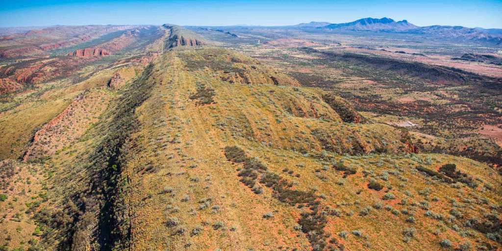 An aerial view of the West MacDonnell ranges – to be followed West to summit Mount Sonder, to the far right.