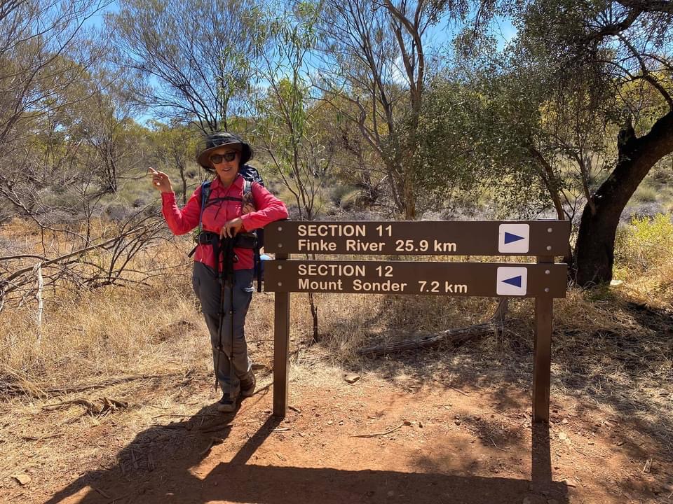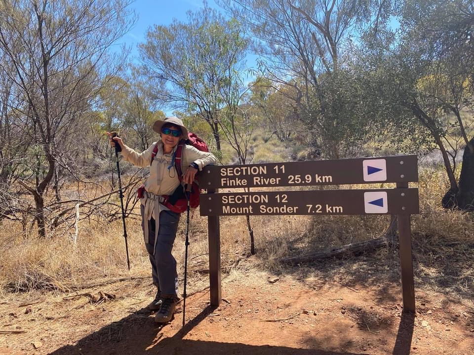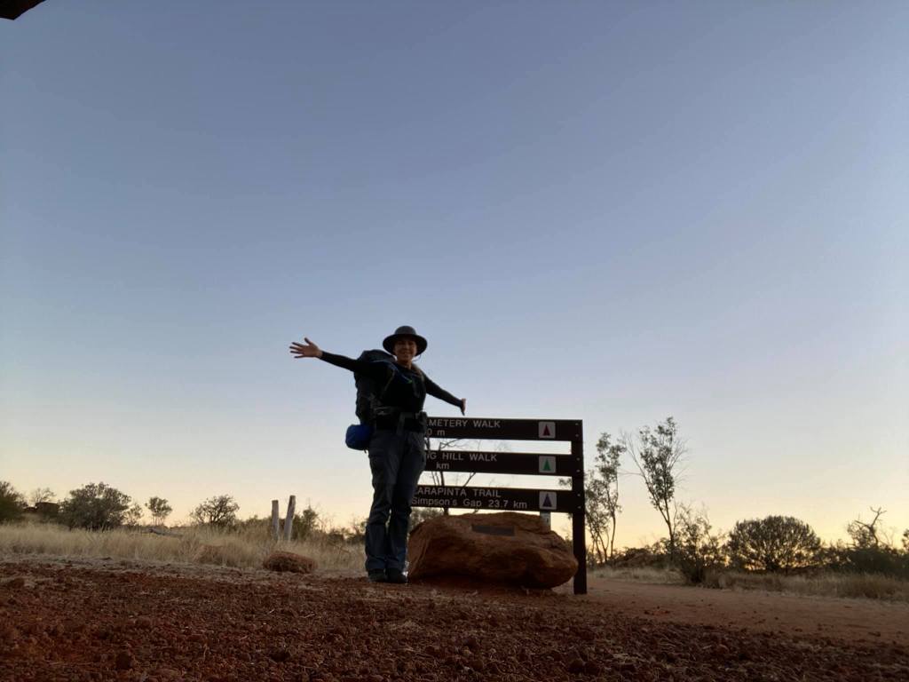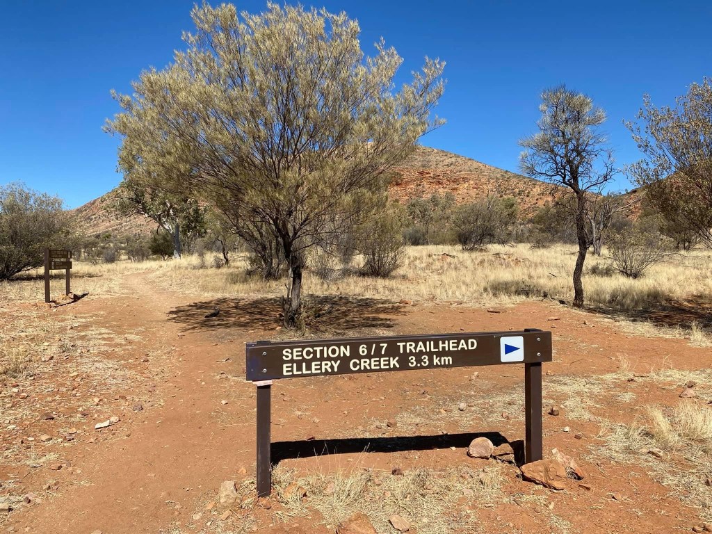 I felt so tired and sleepy now, it was time to coax and coach myself over the last few kilometres. Finally, I walked across the sandy bed of Ormiston Creek and onto a tar road! I first passed a public camp ground before finding the classic Larapinta trailhead where I would sleep. It was nearly 5pm and I passed the little food kiosk (which I would dash to the next day!). I felt quite shattered.