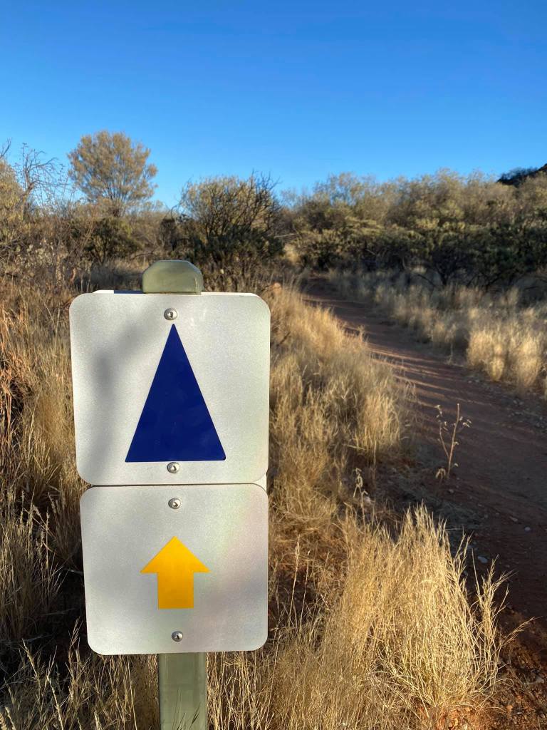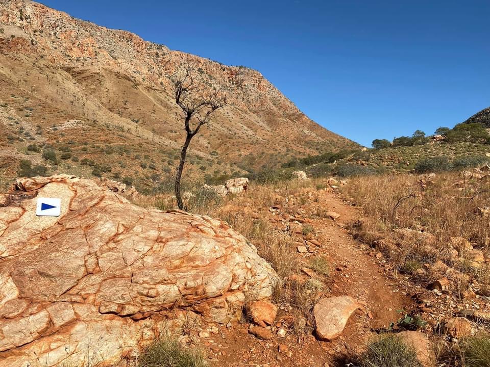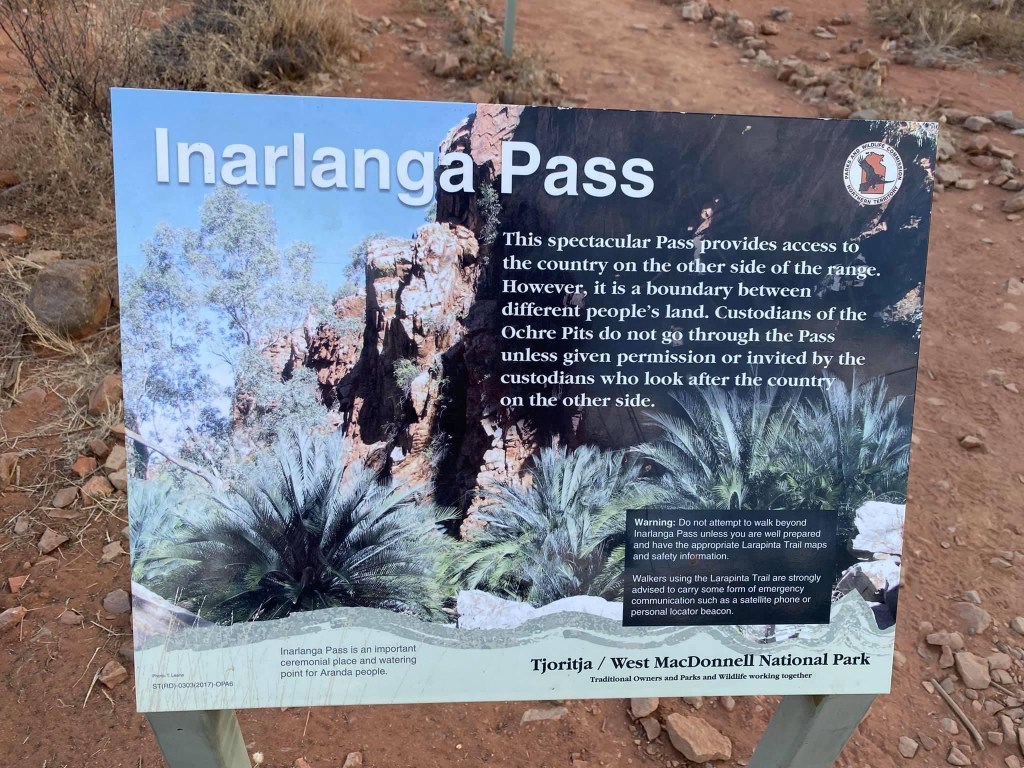 Soon I was at the Inarlanga Pass, an Arrente name for the Echidna. It is one of the easiest gaps through the Heavitree Range and a ceremonial place for the Aranda people. The sign reminded hikers of the sacred nature of this indigenous place and the need for maps and emergency communication.