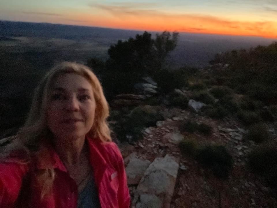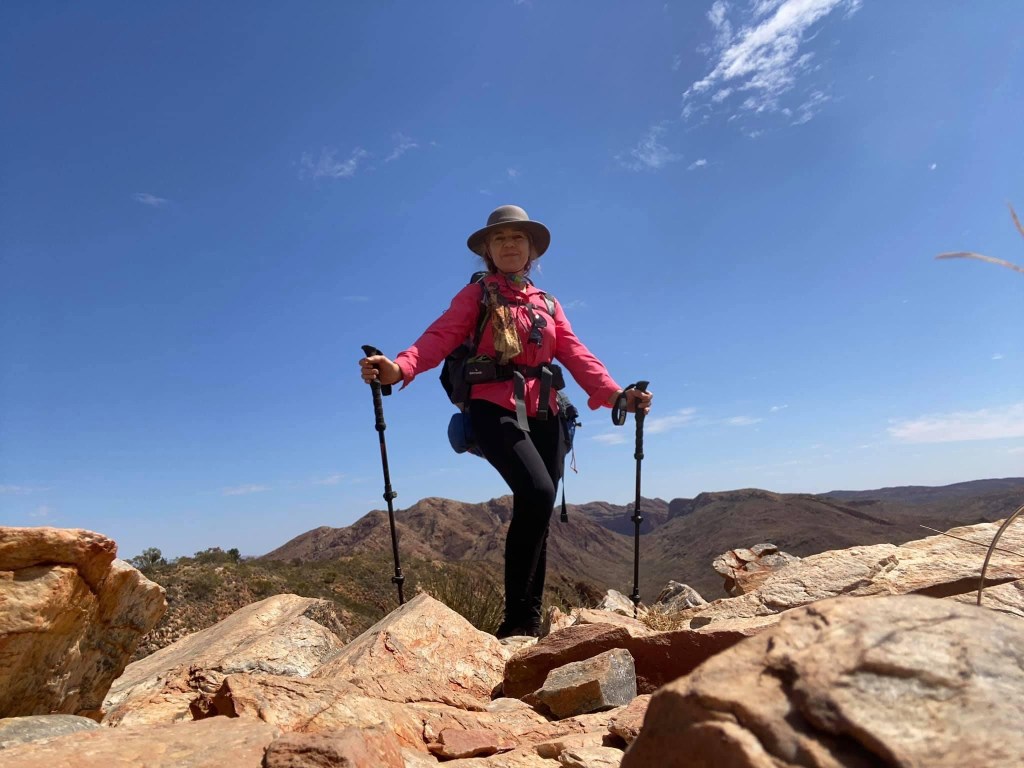 I was only 5km from Standley Chasm but it was slow going with steep ups and downs over rocky ground. Sometimes the terrain on the Larapinta is so taxing you can only cover 1km in one hour. This and the idea of falling keeps you very present!I arrived at Standley Chasm late morning where I knew there was a cafe and the famous cheese burgers I’d read about. I ordered one and a cappuccino and then stupidly realised I still felt nauseous so picked at the burger. I would dream of that half eaten burger in days to follow. I sat next to a long table of Aboriginal ladies and University students who were having a farewell lunch and exchanging gifts. It was very touching to watch. But I was disappointed that I still could not see any hikers. Then suddenly I noticed a man enter who looked like he’d been walking. I went over and before I could catch myself I felt a rush of emotion and promptly burst into tears. He kindly invited me to sit with him. I noticed his wedding band and told him I was missing my husband, I was feeling lonely and there were no hikers walking in my direction. He was going in the opposite direction and assured me he’d passed quite a few ahead. I was so grateful for that encounter with Simon (who happened to own the hiking store in Alice Springs) which allowed me to let go some desperate tears and go on bravely. I was undecided whether to camp at Standley and enjoy a shower and more food or keep going for a steep four-hour climb to Larapinta landmark, Brinkley Bluff (at almost 1200 metres) before sunset. From this high point I knew I could access a bar of Optus reception to make contact with home. I quickly accessed my first food drop supplies. My yearning led me on into the afternoon.