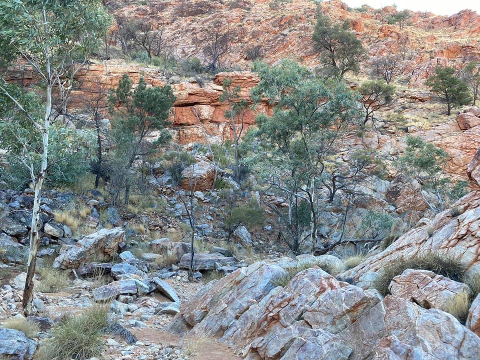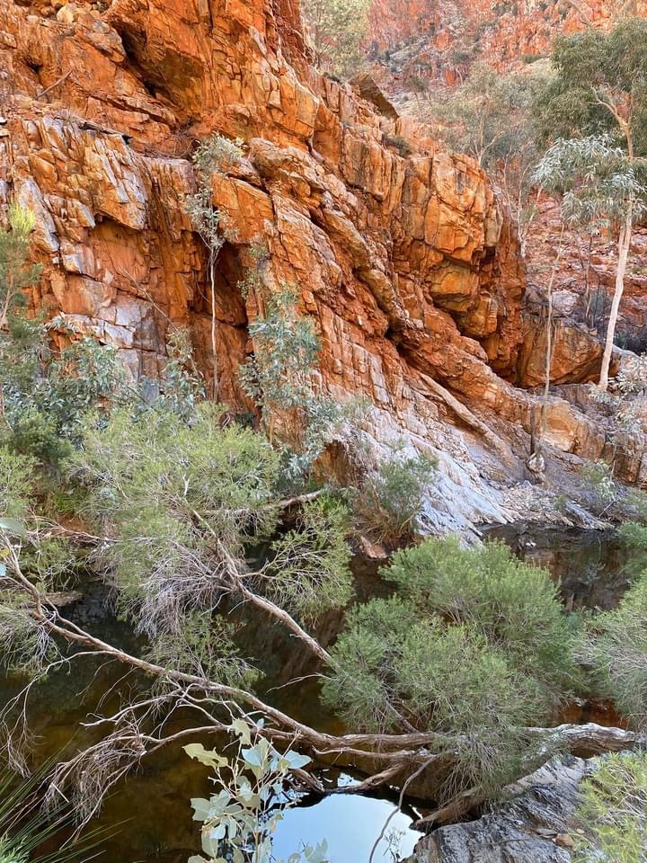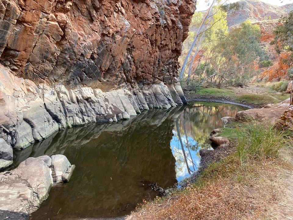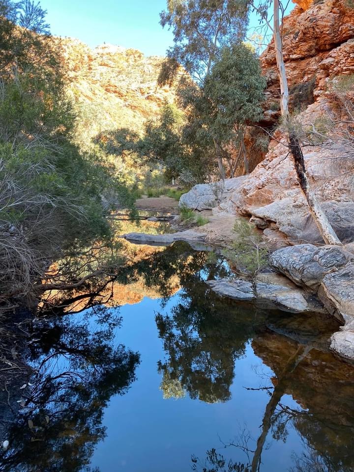 I was supposed to stay at Jay Creek but arrived there early afternoon to witness a dingo step out from behind a bush and eyeball me at the trailhead. This fed my fear and I took off again determined to put some distance between me and it. I walked along a dry riverbed and past the sacred, exquisite Aboriginal Fish Hole where no camping was allowed, aiming for Miller’s flat where I would set up for the night. I ended up camping close to a small still waterhole where I could rinse a few clothes and have a bit of a splash to clean up before dinner and bed. I had inadvertently ended up walking about 28km.