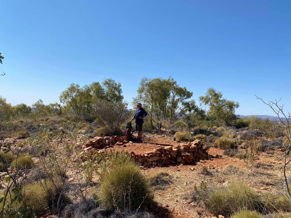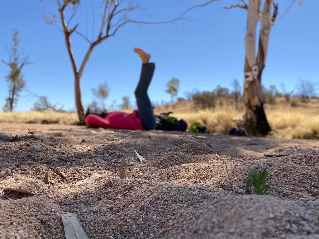 We descended from Hilltop, greeting another flawless day and walked to Rocky Bar Gap for water. Budgies danced around and drank from the dripping tap. We walked the last 11km to Redbank Gorge being led by and closing in on our final destination, Mount Sonder. We cut a swathe over the red earth of mulga country and populations of familiar spinifex.